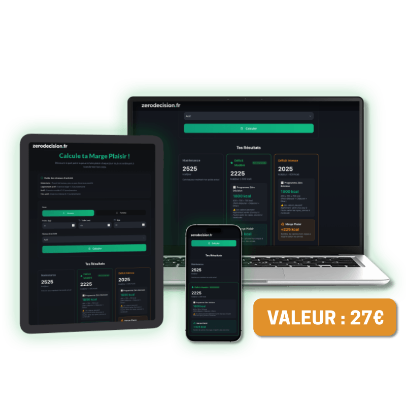 C'est l'outil qui fait tous les calculs à ta place pour que tu puisses te faire plaisir sans culpabilité. Le calculateur établit ta Marge Plaisir quotidienne : les calories disponibles pour tes apéros, desserts, verres d'alcool ou petits plaisirs. Tu sauras à quel point tu peux te faire plaisir chaque jour tout en continuant à transformer ton corps.